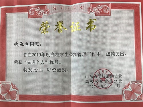 近日,由山东省后勤协会主办的山东省高校学生公寓评优表彰活动结果揭晓,我院学工部社区管理科臧延云老师荣获“2019年山东省高校学生公寓管理工作先进个人”荣誉称号。