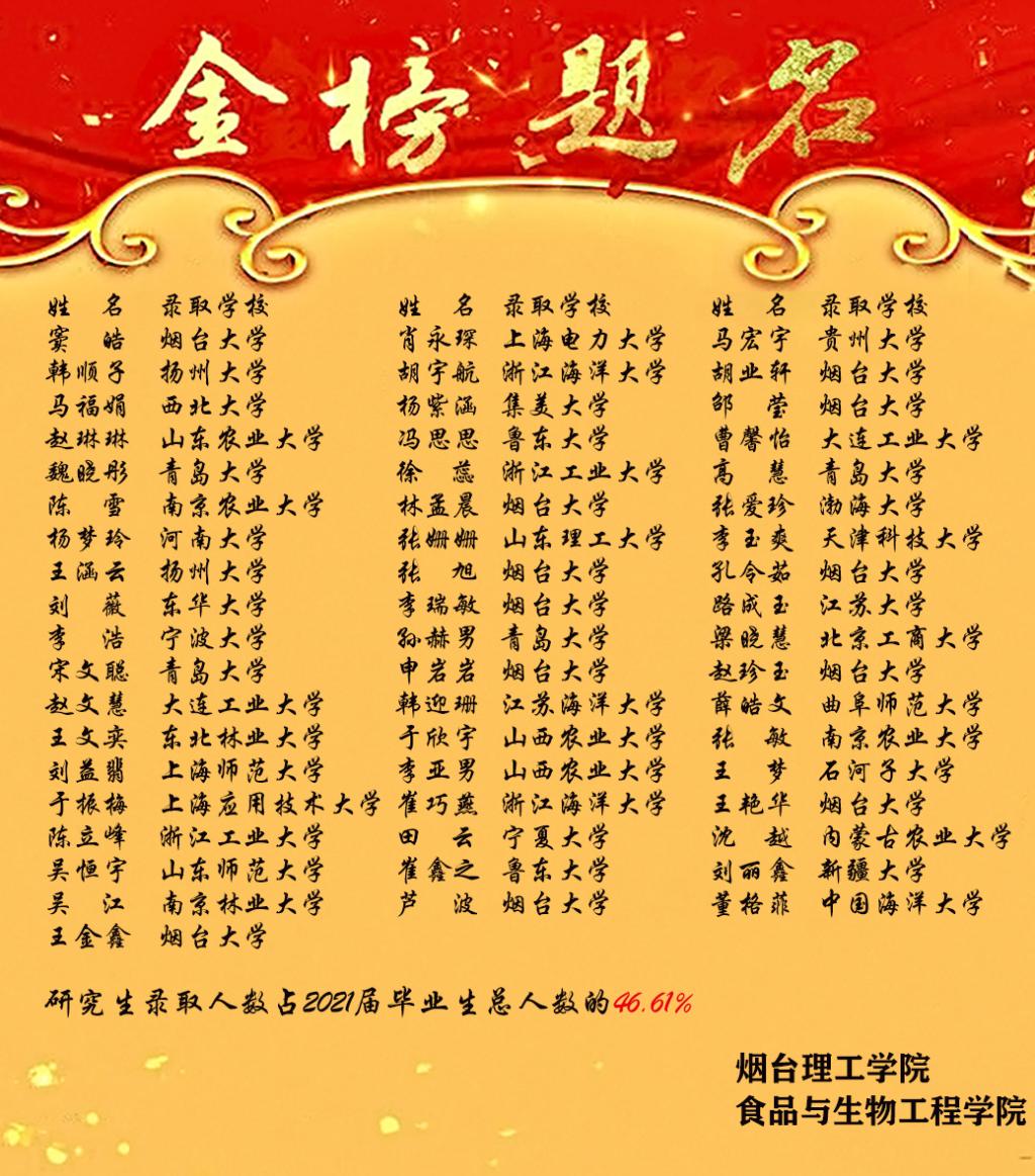 又是一年收获季,又是一年报喜时,随着2021年硕士研究生录取结果的陆续公布,食品与生物工程学院考研学子捷报频传,录取人数再创新高!食品与生物工程学院118名应届毕业生中,96名同学报考,63名同学上线,55名同学收到拟录取通知,上线率为65.63%,录取率为57.29%,考研上线人数比例、录取人数比例均创历史新高。其中,10名同学考取985、211院校,占考研成功人数的18.18%。今年,食品与生物工程学院再现考研“学霸”宿舍,食1702-1班226宿舍的5名女生全员考研成功。