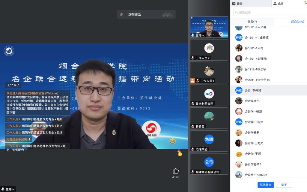 本次活动为第一期,学校与鲁南制药、新希望六和集团、烟建集团、杰瑞集团四家名企联动,依次通过腾讯会议远程直播宣讲互动方式直播带岗。各用人单位在公司远程直播宣讲,开展现场与线上可视化招聘推介、职场分享、互动交流、答疑解惑、投递简历等环节,实现毕业生与用人单位“面对面”招聘场景的“零距离”有效宣讲。