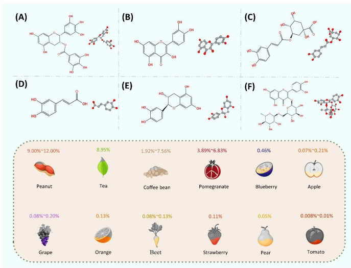 图2:展示6中常见的多酚类物质的2D及3D结构以及富含多酚类的果蔬植物及其含量