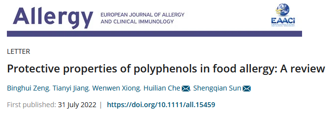 近日,我校食品与生物工程学院副教授孙盛千联合中国农业大学车慧莲教授团队在国际著名顶级期刊《Allergy》(中科院SCI一区TOP,IF=14.71)发表了题为“Protective Properties of Polyphenols in Food Allergy: A Review”的综述论文。这是我校首次在《Allergy》上发表论文,代表我校在食品与生物工程领域取得的一项高水平研究成果。