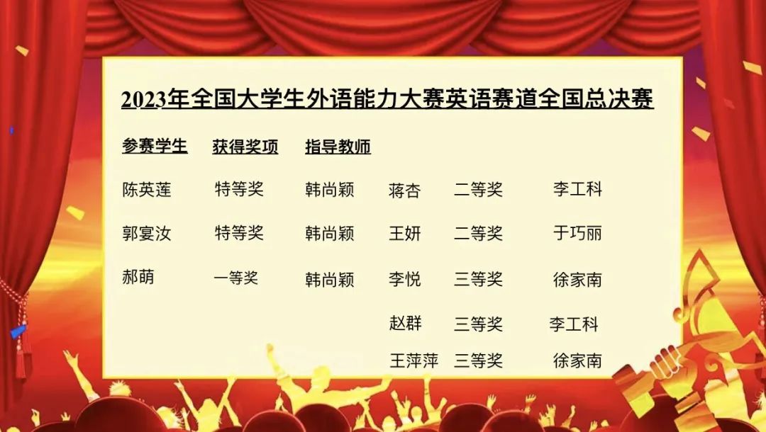 经过激烈的角逐,我校陈英莲与郭晏汝荣获全国决赛特等奖,郝萌荣获全国决赛一等奖,王妍荣获全国决赛二等奖,李悦与王萍萍荣获全国决赛三等奖。本次比赛所取得的优异成绩,得益于参赛同学自身的不懈努力,也离不开各指导教师的悉心教导。这充分体现了外国语学院强化教师教育特色、深化教育教学改革的成效与成果。