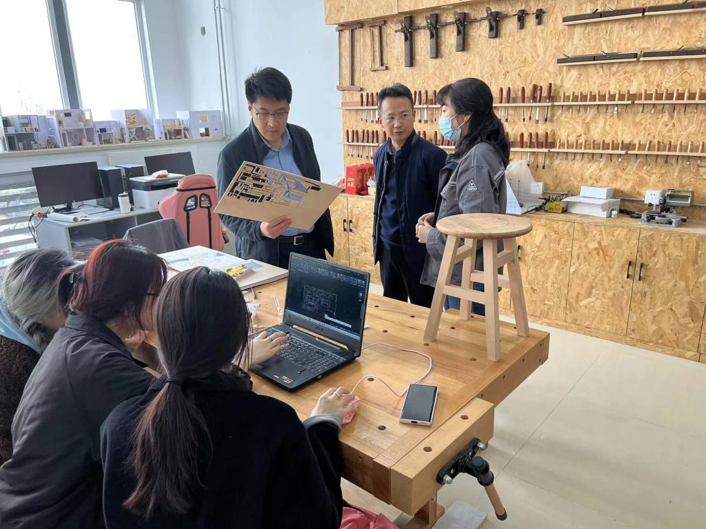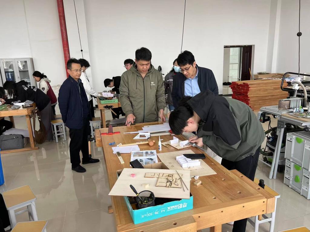 随后,调研组一行又来到综合楼一楼的模型制作实验室,深入到实验实训课堂中。校领导和相关部门负责人与正在进行实验的学生充分深入交流,询问了关于课程实施、学生的学习体会等内容,并观摩了建筑模型搭建的过程。