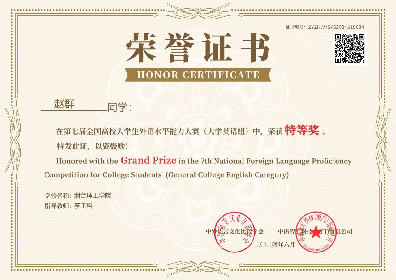 本次比赛采取网络赛形式进行,分为校级初赛和全国复赛两级选拔。比赛内容涵盖听力、写作、翻译、人文思辨等综合外语技能的考察,旨在鼓励学生在语言表达与实践应用等方面的全面发展。我校学子们踊跃参赛,认真备赛,态度积极,训练刻苦,稳扎稳打,为比赛积累了宝贵经验。本届大赛获奖者除获得赛事奖项证书以外,还获得了组委会颁发的配套翻译技能证书(BETT),这一荣誉不仅肯定了他们的外语能力,也标志着其职业技能的权威认证。“语言+技能”的双重认证拓宽了我校学生的就业前景,为大家的职业发展开辟了更为广阔的道路。