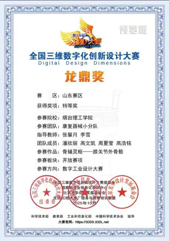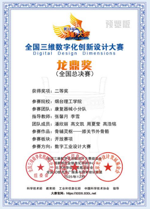 近日,第18届全国三维数字化创新设计大赛省级赛和全国总决赛先后圆满收官。健康学院张馨月、李雪两位老师指导的健康服务与管理专业潘欣丽团队“康复器械小分队”,凭借作品《骨辅灵枢——膝关节外骨骼》一路过关斩将,先是斩获省级特等奖,接着又荣获全国总决赛二等奖,在全国科技创新的舞台上充分彰显了烟台理工学院学子的创新能力与拼搏风采。