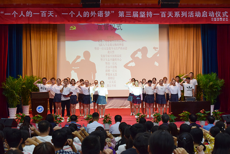9月14日,外语系于一教207举办第三届“坚持一百天”启动仪式。院长助理尤敬法、莫红菊、杜希成、史毅,外语系主任肖德法、党总支书记张廷国、团总支书记温少斐以及2018级全体新生参加。
